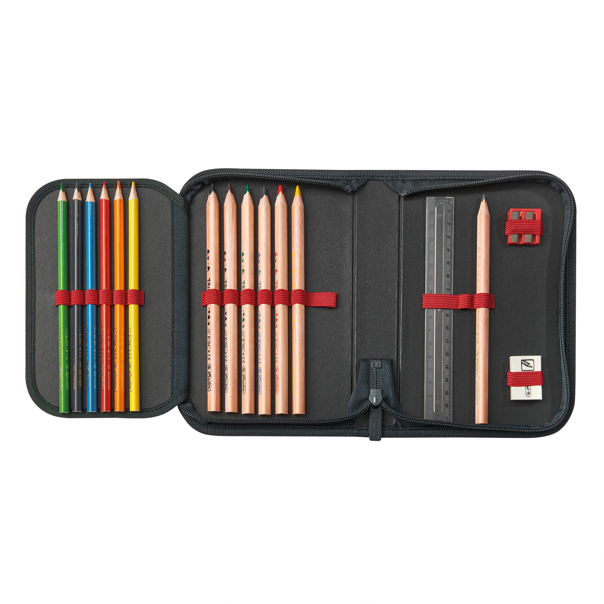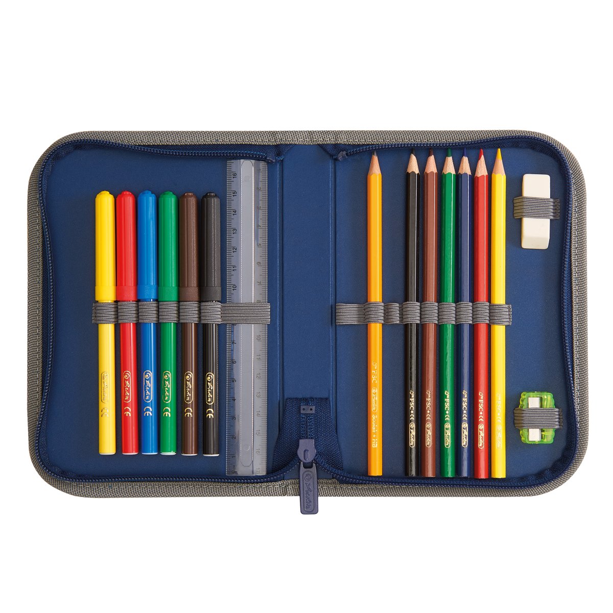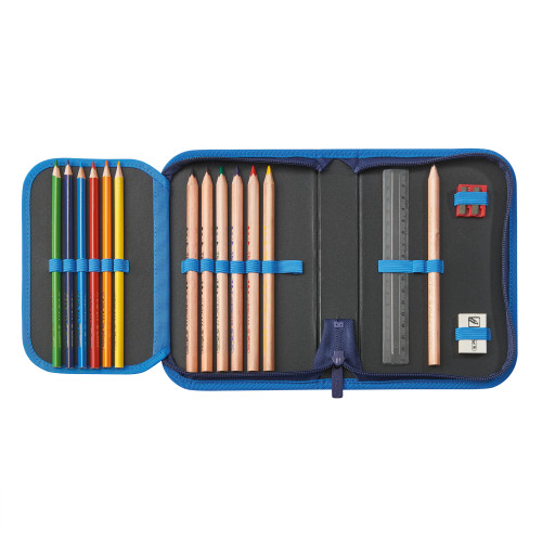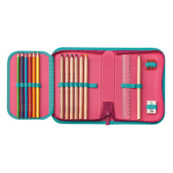 Schüleretui Tropical mit Inhalt offen aufgeklappt, Innenansicht |
