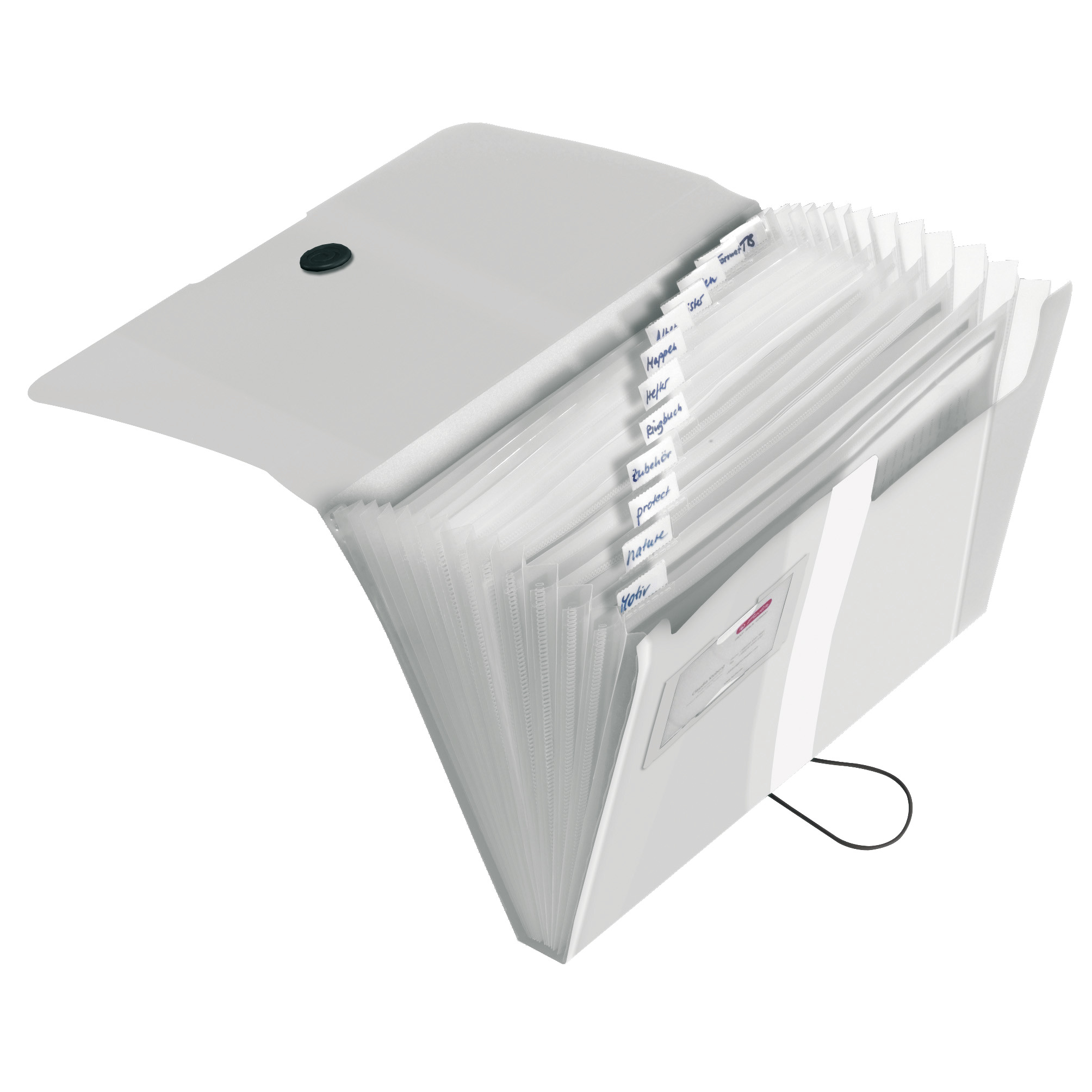 PP-Folie mit Design-Aufdruck, mit dehnbaren 12 Fächern, Taben beschriftbar mit Tasche im Visitenkartenformat Gummizug, rund, mit Verschlussknopf transparent farblos 1 Stück |