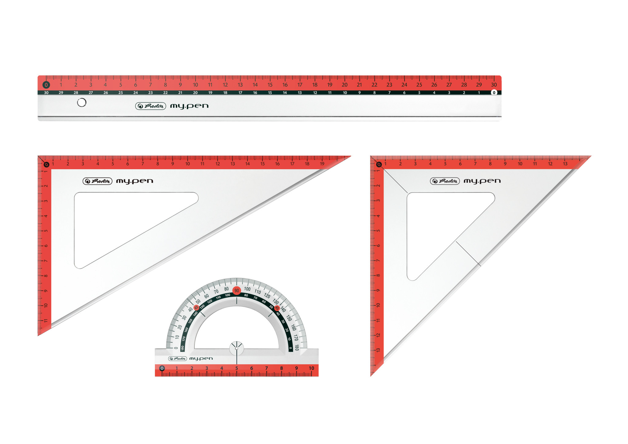 Kernvorteile | Herlitz my.pen Geometrieset; Inhalt: 1 Lineal 30cm, 1 Winkelmesser 10cm, 2 Geometriedreiecke; Bruchsicheres Material; Kunststoff; Farbig sortiert; Keine Farbauswahl möglich |