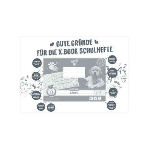 | Kernvorteile | Schulheft A5 Lineatur 0 für 1. Schuljahr; farbig hinterlegte Lineatur mit verstärkter Grundlinie und Schreiblernhaus von Pädagogen entwickelt und empfohlen; mit Anleitung zur Nutzung des Leicht-Lern-Systems; Schutz durch abgerundete Ecken; 16 Blatt holzfreies 80g/m² Schreibpapier; FSC zertifiziert Beschriftungsfeld auf der Vorderseite; Deckblattgestaltung Motiv Hund; |