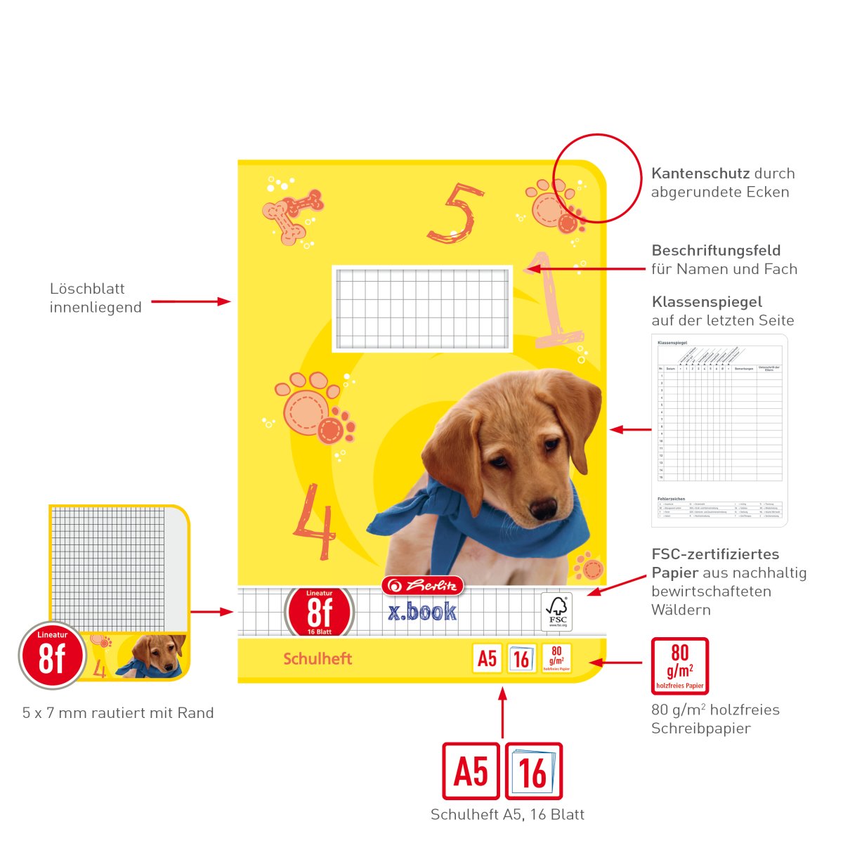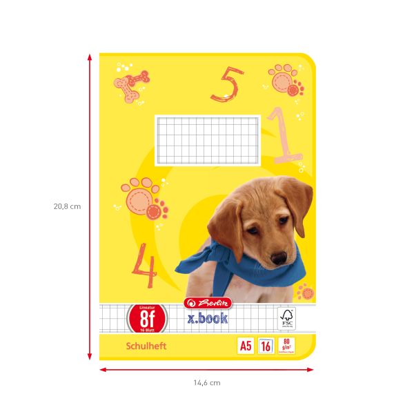 | Kernvorteile | Schulheft A5 Lineatur 8f rautiert 5 x 7 mm mit Rand; Schutz durch abgerundete Ecken; 16 Blatt holzfreies 80g/m² Schreibpapier; FSC zertifiziert Beschriftungsfeld auf der Vorderseite; mit Klassenspiegel auf der letzen Seite und blauer Deckblattgestaltung Motiv Hund; |