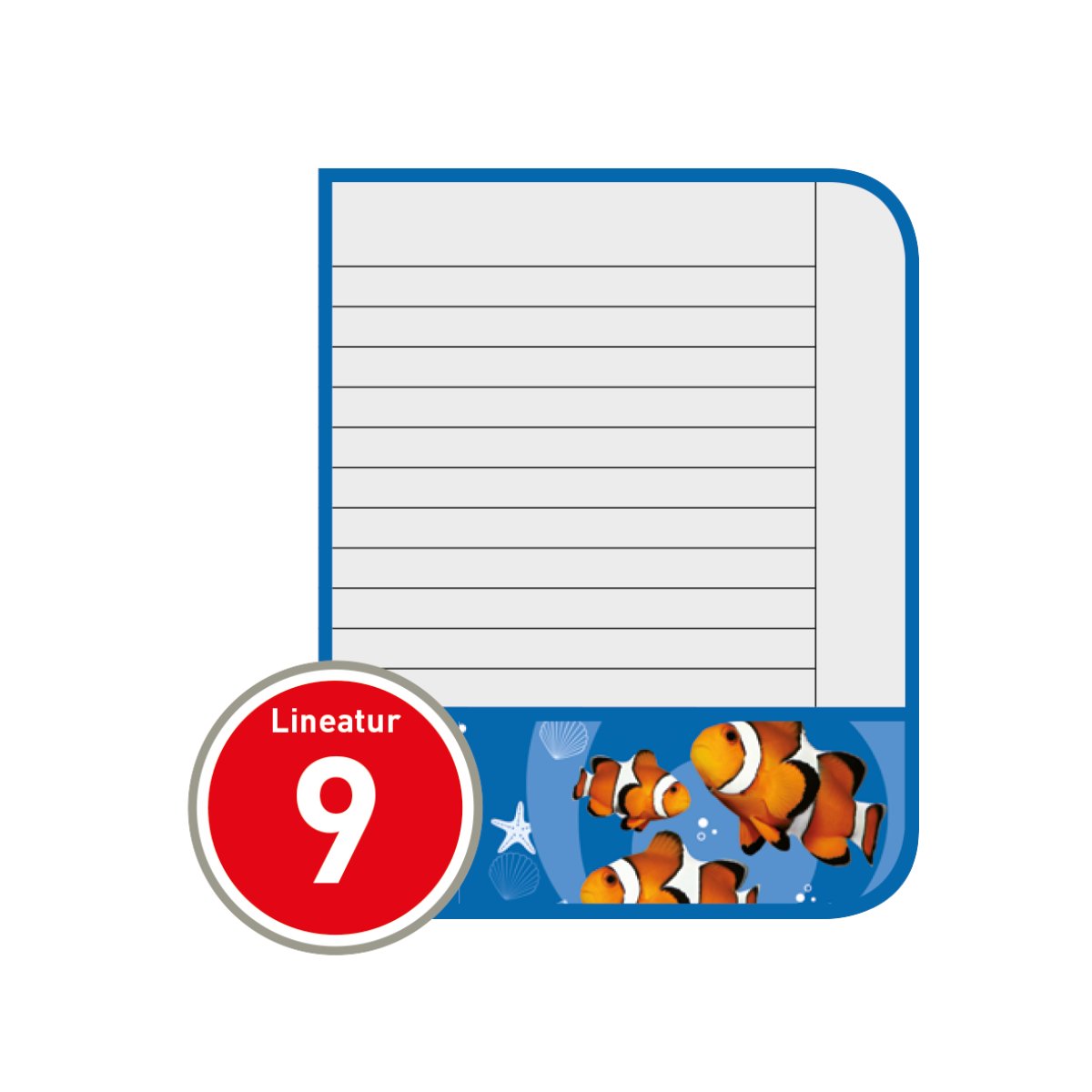 | holzfreies Papier, 80g/m² weiß, FSC Mix, 16 Blatt abgerundete Ecken Lineatur 09 (liniert mit Rand) Motiv Fische 1 Stück  |