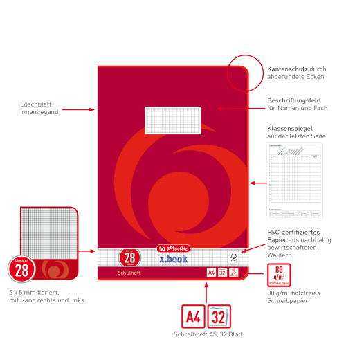 | Kernvorteile | Schulheft A4 Lineatur 28 kariert mit Innen- und Außenrand; Schutz durch abgerundete Ecken und robustes Deckblatt; 32 Blatt holzfreies 80g/m² Schreibpapier; FSC zertifiziert Beschriftungsfeld auf der Vorderseite; mit Klassenspiegel auf der letzen Seite und roter Deckblattgestaltung; |