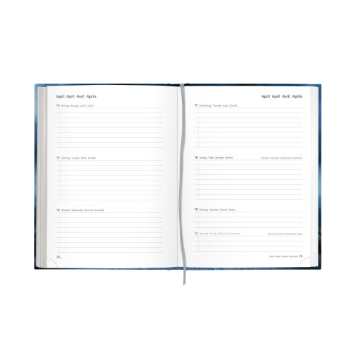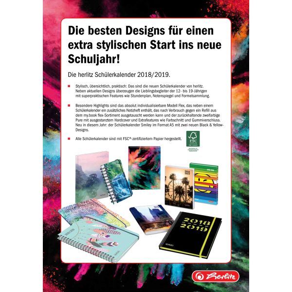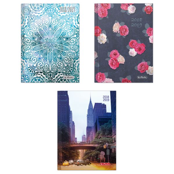 | Hardcover wattiert, Glanzfolienkasch. 160 Seiten, Papier 70g/m², FSC Mix 1 Wo. = 2 Seiten, Aug. 2018-Juli 2019 4-spr.: D,GB,F,I, Ferien D,A,CH,F Stundenplan, Notenliste, Leseband, Eckperf. 3 Motive sortiert, Inh.druck 1-farb. 1 Stück  |