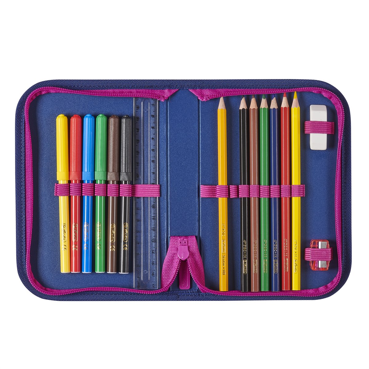 Polyester 37 x 31 x 22 cm Klickschloss, ergon. Rückenpolster, Brustgurt, 3M Material mit FSC ® zertifizierten Bunt- und Bleistiften Glitzer befüllt mit Schüleretui 16tlg., Faulenzer rund und Sportbeutel |