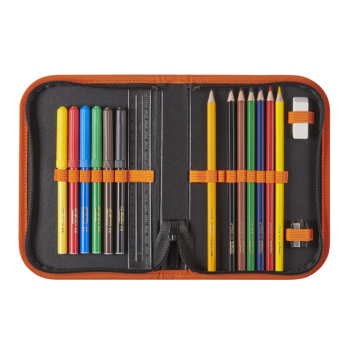 Polyester 37 x 31 x 22 cm Klickschloss, ergon. Rückenpolster, Brustgurt, 3M Material mit FSC ® zertifizierten Bunt- und Bleistiften 3D Siebdruck befüllt mit Schüleretui 16tlg., Faulenzer rund und Sportbeutel |