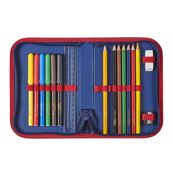 Polyester 37 x 31 x 22 cm Klickschloss, ergon. Rückenpolster, Brustgurt, 3M Material mit FSC ® zertifizierten Bunt- und Bleistiften 3D-Gummiapplikation befüllt mit Schüleretui 16tlg., Faulenzer rund und Sportbeutel |