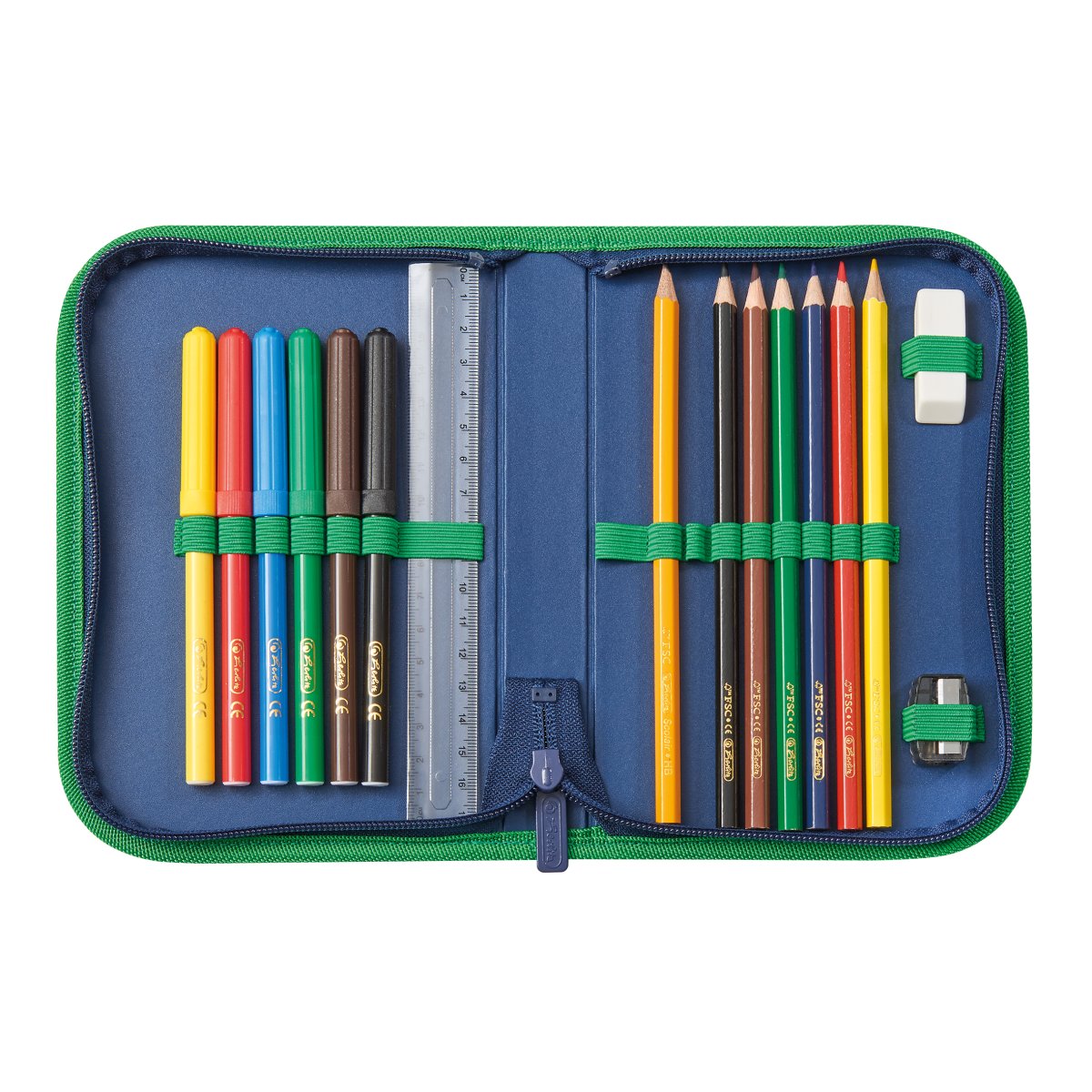 Polyester 36 x 28 x 21 cm Softkorpus, Klickschloss mit Reflektor ergon. Rückenpolster, Brustgurt verstellbare Schultergurte stabile Bodenplatte Orafol Material, Leichtgewicht unter 750g 2 abnehmbare Applikationen mit Klett Schüleretui 16tlg. mit FSC zertifizierten Bunt- und Bleistiften Faulenzer rund und Sportbeutel |