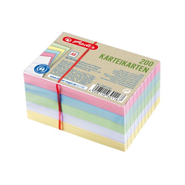 Kernvorteile | Karteikarten A8; Liniert; Recycling Papier; Farbe: farbig sortiert; Grammatur: 180g/m2; Inhalt: 200 Stück |