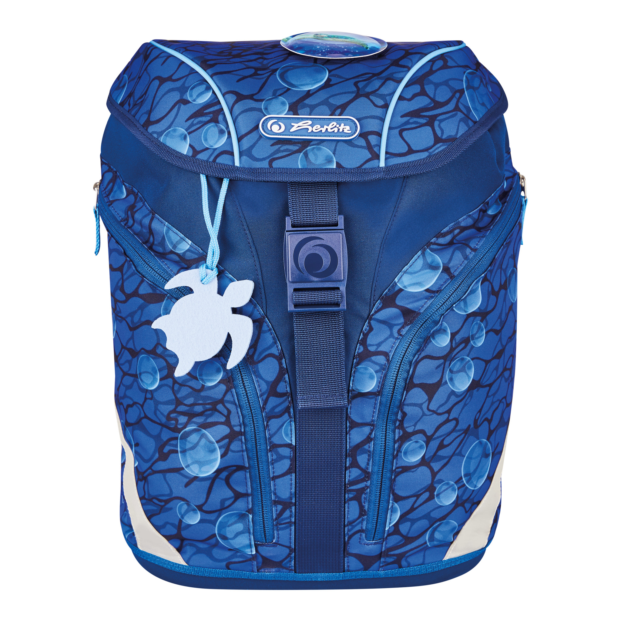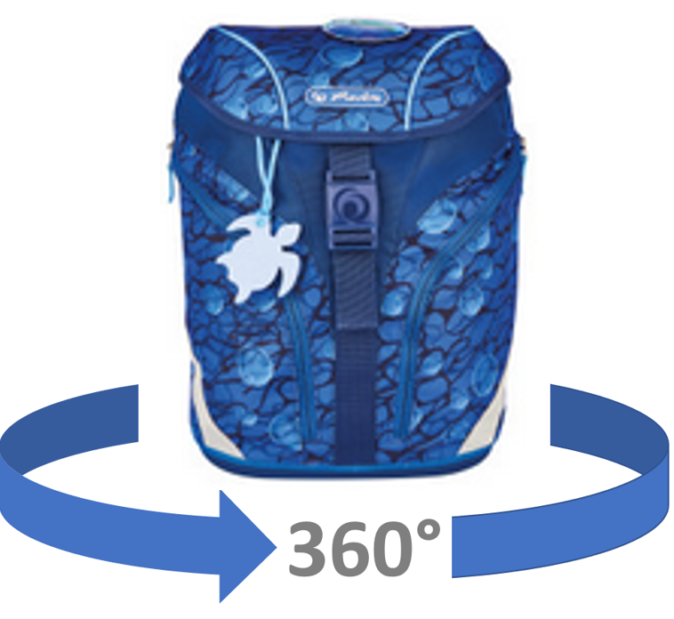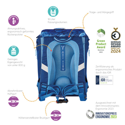 Kernvorteile | Grundschulrucksack mit ergonomischem Rückenpolster; Leergewicht des Schulranzens unter 800g; verstellbare Schultergurte; IGR-Zertifizierung; GRS-Zertifizierung, Oeko-Tex 100 Standard, flexibler Brustgurt; Innenfach mit Bücherfach; 2 Seitentaschen mit Reißverschluss; Orafol Reflexmaterial; Fidlock Magnetschloss; stabiler Boden mit Kunststoff-Füßen; Befüllung: 16tlg. Etui; Sportbeutel; Faulenzer rund; Brotbox blau; 1 abnehmbare Applikation mit Klett (Patch); 1 Filzanhänger Schildkröte in eisblau; Maße: 38 x 28 x 23 cm; Volumen: ca. 18l |