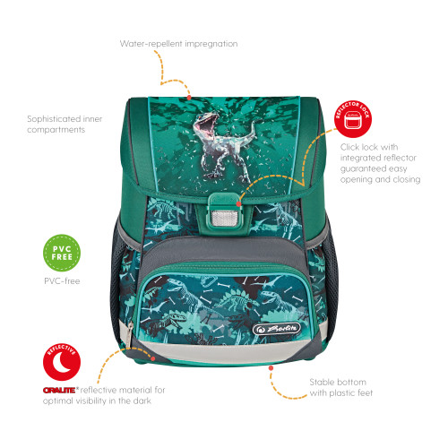 Kernvorteile | Eigengewicht unter 900g; ergonomisch geformte Rückenpolster; verstellbare Schultergurte; höhenverstellbarer Brustgurt; angenehme Passform; Orafol Reflexmaterialien; Klickschloss mit Reflektor; geräumiges Innenfach mit separatem Bücherfach; 1 Fronttasche; 2 Seitentaschen mit Gummizug; stabile Bodenplatte; Maße: 37x31x22cm; Gewicht: unter 1kg; Volumen: ca. 17l; Material: Polyester |