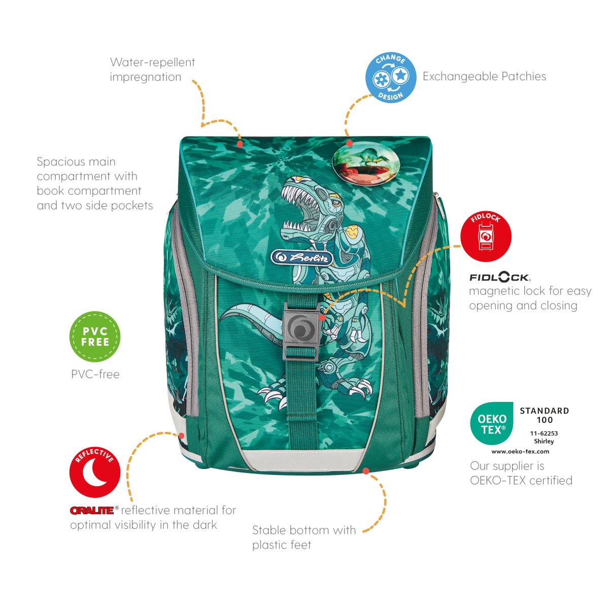 Kernvorteile | PVC-freier herlitz Schulranzen FiloLight; mit seiner Füllung ist der perfekte Begleiter für Erstklässler; Ausgestattet mit allem notwendigen Zubehör; Der schlanke Schnitt des Schulranzens passt auch Kindern mit schmalen Schultern; verstellbare Schultergurte; höhenverstellbarer Brustgurt garantiert einen optimalen Sitz; Maße von 38x32x22 cm; Füllvolumen von 18 Litern; Oeko-Tex 100 Standard; ergonomisch geformter und atmungsaktiver "AirFlow"-Rücken; ist immer angenehm zu tragen; hohe Qualität des Außenmaterials; stabile Bodenplatte garantiert volle Sicherheit für alle Bücher; Kinder sind durch das Orafol-Reflexmaterial am gesamten Rucksack geschützt; Zahlreiche Fächer und Taschen machen es leicht alle Dinge vom Schulanfang an zu organisieren; Schulranzen verfügt über zwei Reißverschluss-Außentaschen; speziell integriertes Fach für alle schweren Bücher; Magnetverschlusses von Fidlock lässt sich der Schulranzen ganz einfach öffnen und schließen; Leergewicht des Schulranzens unter 1kg; Schulranzen FiloLight Plus ist als 4-teiliges Set erhältlich; Füllung umfasst ein mit 16 Teilen gefülltes Etui; Faulenzer Sport; Sportbeutel |