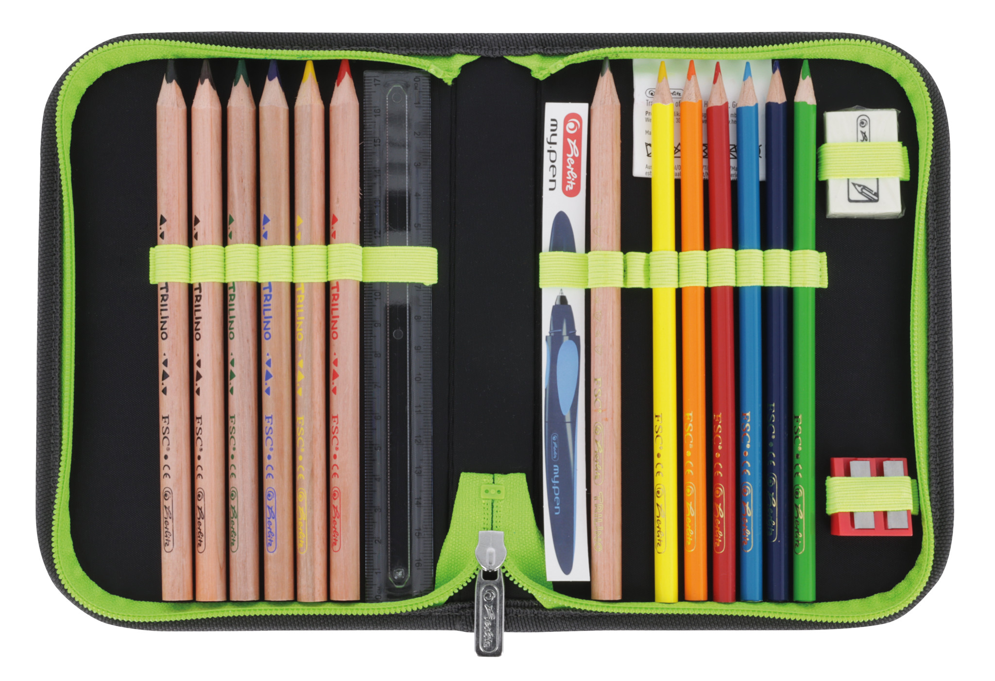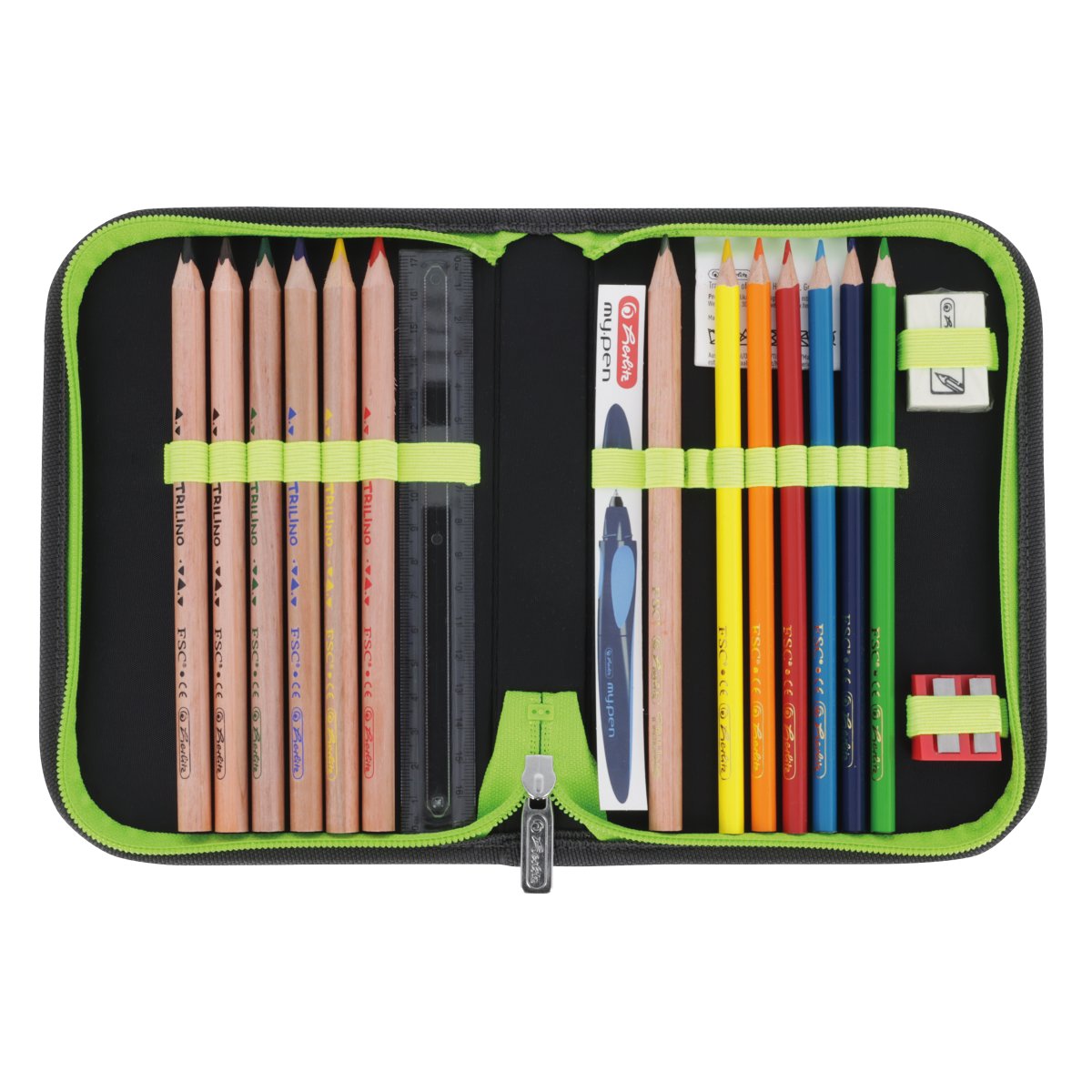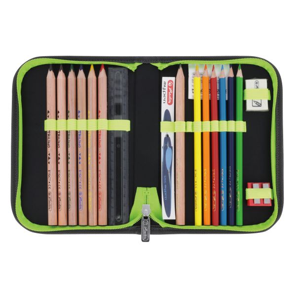 Polyester 38 x 32 x 22 cm entspricht der DIN 58124, ergoActive® System, IGR-Zertifizierung, Magnetschloss, stabile Bodenschale Brustgurt, abnehmbarer Beckengurt 1 abnehmbare Applikationen mit Klett 1 Filzanhänger Schildkröte Schüleretui 16tlg., Sportbeutel, Faulenzer Sport, Brotbox, mit FSC zertifizierten Bunt- und Bleistiften |