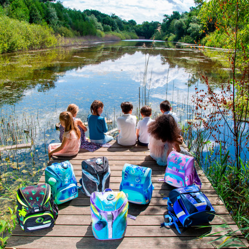 | Polyester 38 x 28 x 23 cm Ergonomisches Rückensystem mit IGR-Zertifizierung und „Air Flow“, Magnetschloss, stabile Bodenschale Brustgurt, abnehmbarer Beckengurt 1 abnehmbare Applikation, 1 Pompom Schüleretui 16tlg., Sportbeutel, Faulenzer oval und Brotdose mit FSC zertifizierten Bunt- und Bleistiften |