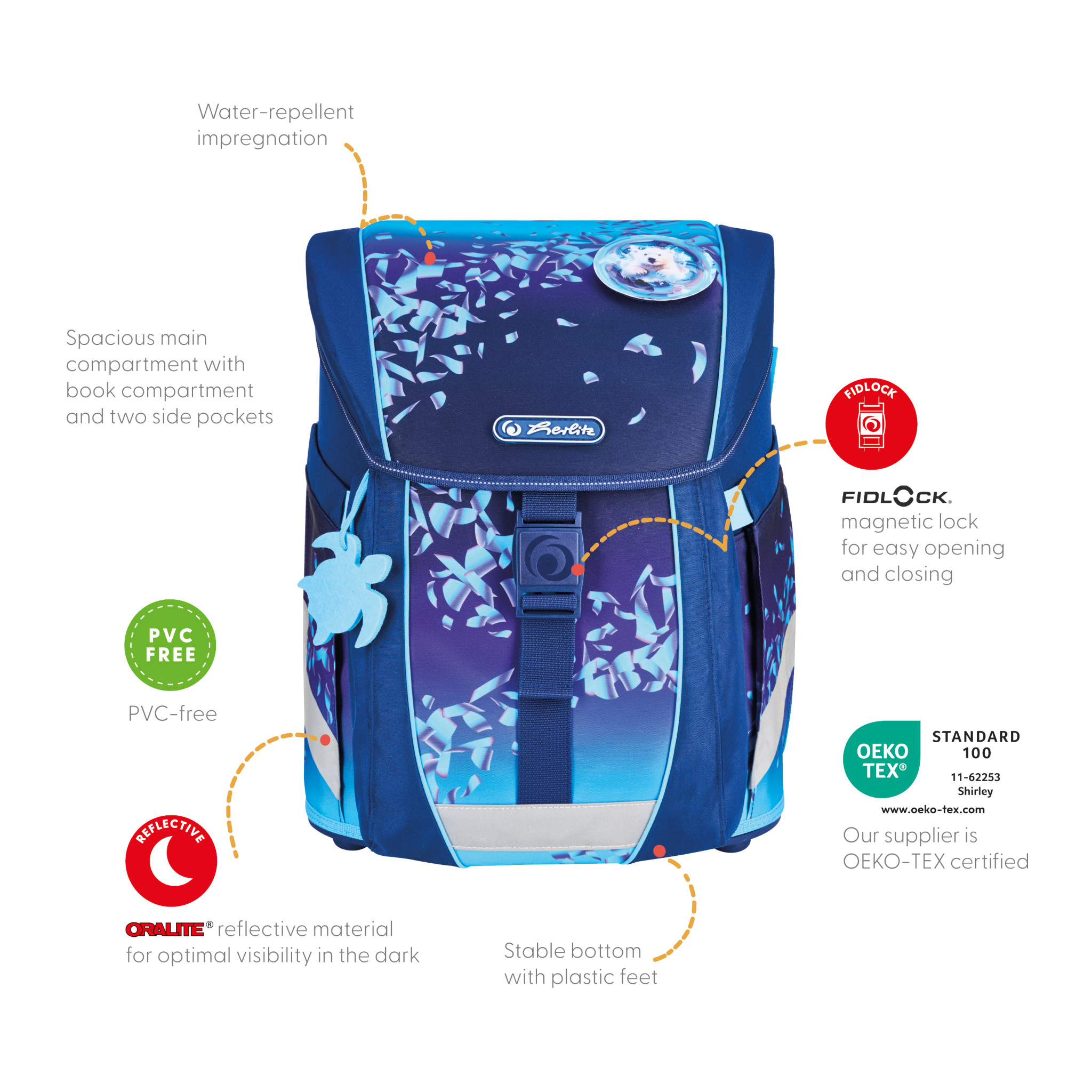 Polyester 39 x 32 x 23 cm ergoActive® System, IGR-Zertifizierung, Magnetschloss, stabile Bodenschale Brustgurt, abnehmbarer Beckengurt 1 abnehmbare Applikationen mit Klett 1 Filzanhänger Schildkröte Schüleretui 16tlg., Sportbeutel, Faulenzer Sport, Brotbox, mit FSC zertifizierten Bunt- und Bleistiften |