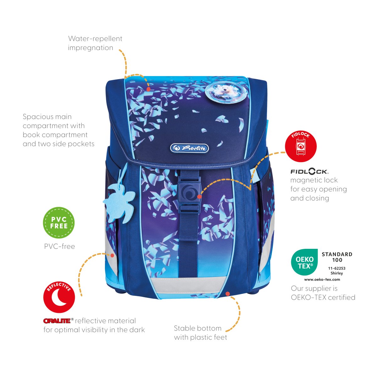 | Polyester 39 x 32 x 23 cm ergoActive® System, IGR-Zertifizierung, Magnetschloss, stabile Bodenschale Brustgurt, abnehmbarer Beckengurt 1 abnehmbare Applikationen mit Klett 1 Filzanhänger Schildkröte Schüleretui 16tlg., Sportbeutel, Faulenzer Sport, Brotbox, mit FSC zertifizierten Bunt- und Bleistiften |