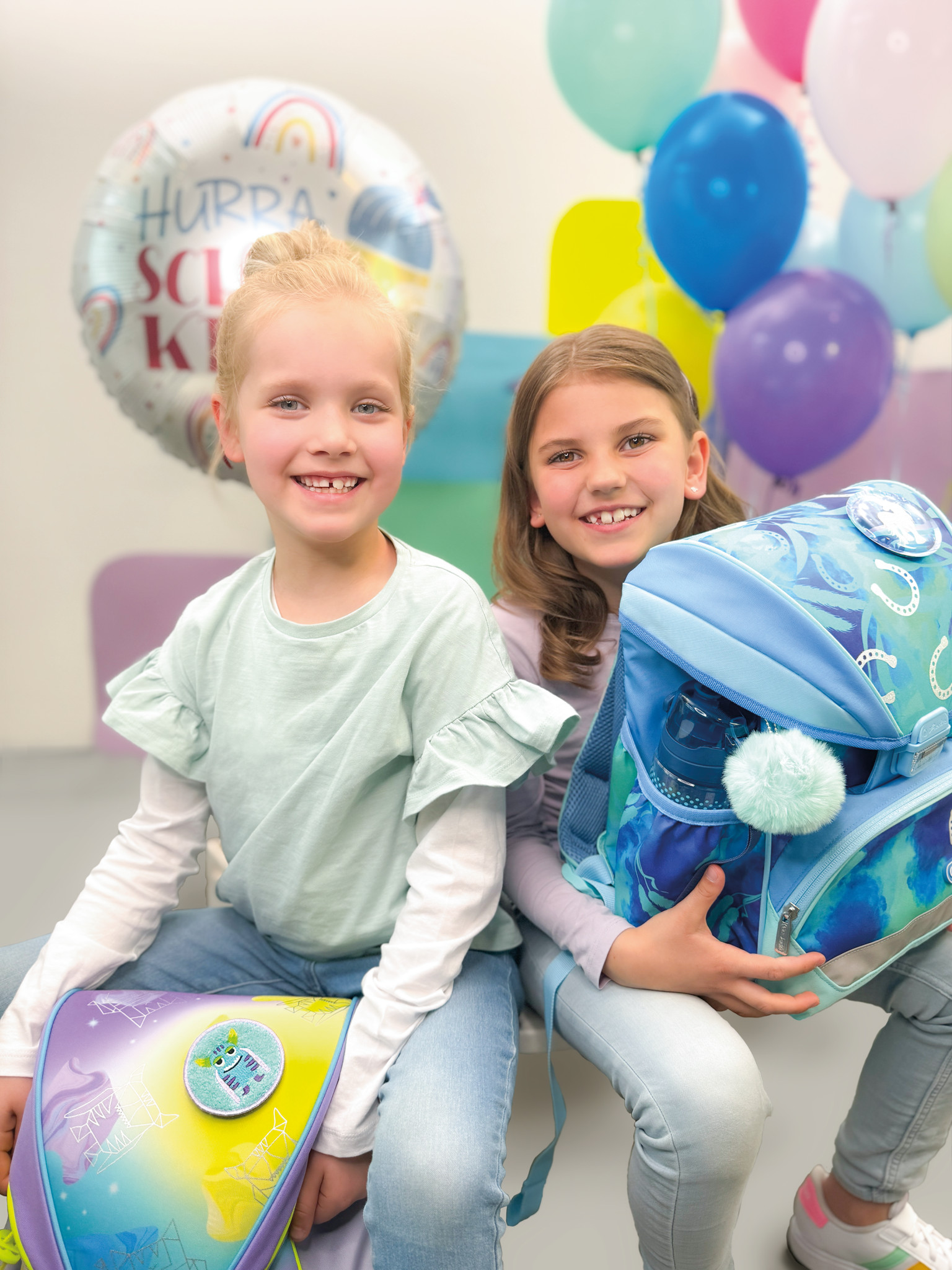 | Polyester 39 x 32 x 25 cm Softkorpus, Klickschloss mit Reflektor Leichtgewicht unter 750g ergonom. Rückenpolster, Brustgurt verstellbare Schultergurte stabile Bodenplatte, Orafol Reflexmaterial 1 abnehmbare Applikation mit Klett, 1 Pompom Schüleretui unbefüllt mit 2 Klappen, Faulenzer oval und Sportbeutel |