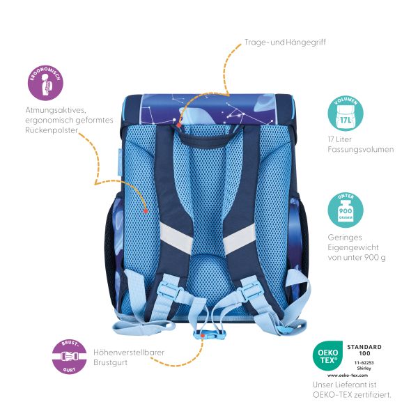 | Kernvorteile | Eigengewicht unter 900g; ergonomisch geformte Rückenpolster; verstellbare Schultergurte; höhenverstellbarer Brustgurt; angenehme Passform; Orafol Reflexmaterialien; Klickschloss mit Reflektor; geräumiges Innenfach mit separatem Bücherfach; 1 Fronttasche; 2 Seitentaschen mit Gummizug; stabile Bodenplatte; Befüllteile: Sportbeutel; Schüleretui 16tlg; Faulenzer rund; Maße: 37x31x22cm; Gewicht: unter 1kg; Volumen: ca. 17l; Material: Polyester |