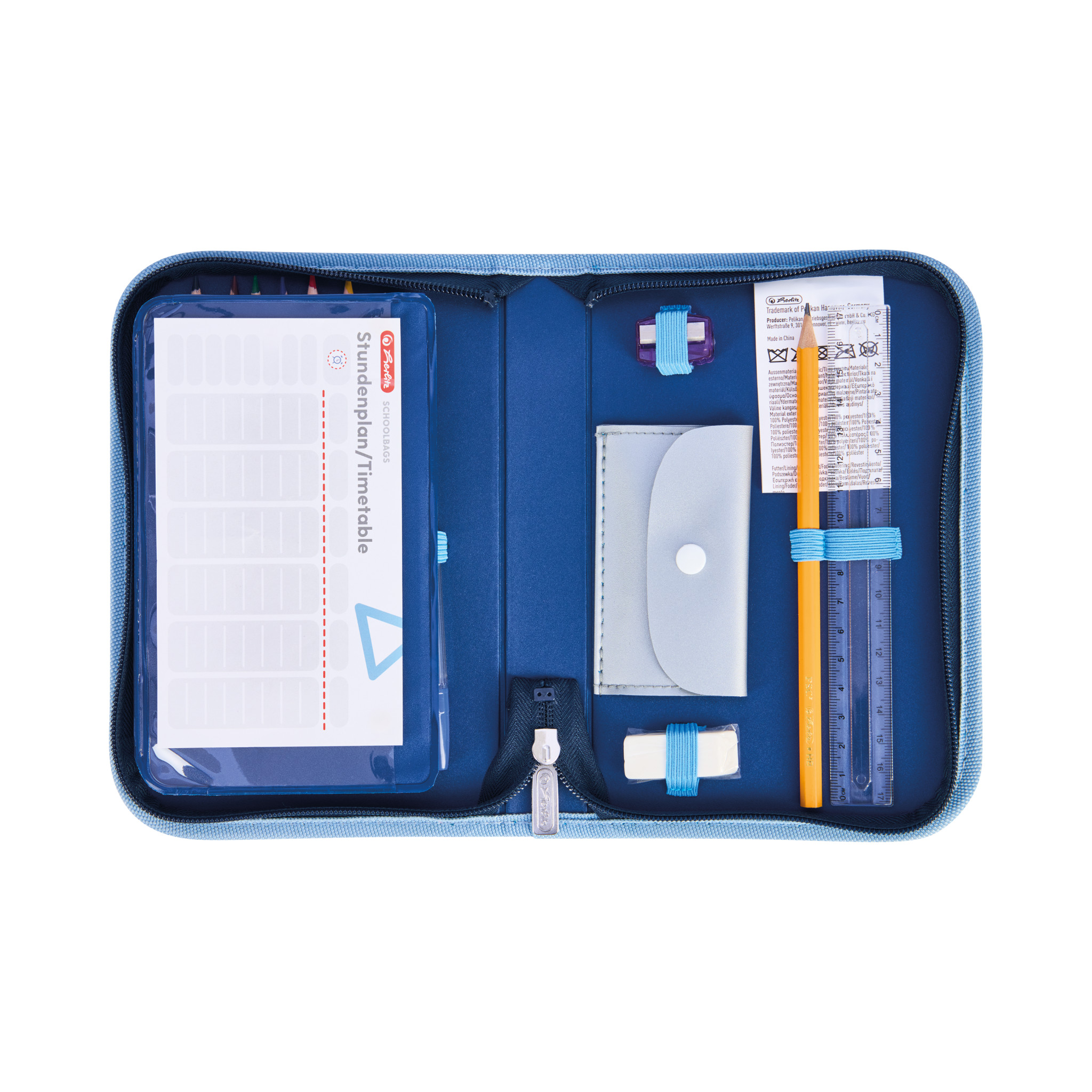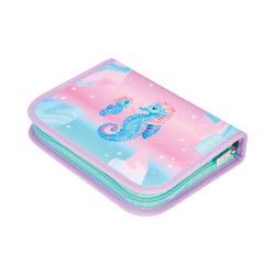 Kernvorteile | Für Schule; Etui mit 1 Klappe; mit farbigem Reißverschluss; Schlaufen in unterschiedlichen Größen; guter Überblick, farbiges Innenmaterial farbig passend zum Motiv; farbige Stifteschlaufen; Maße: 20,5 x 14 x 3,5 cm; Material: Polyester; Befüllung: mit FSC zertifizierten Bunt- und Bleistiften, Fasermaler; 4 Motive: Ocean Lights, Game Changer, Lucky Horse, Cosmic Explorer |