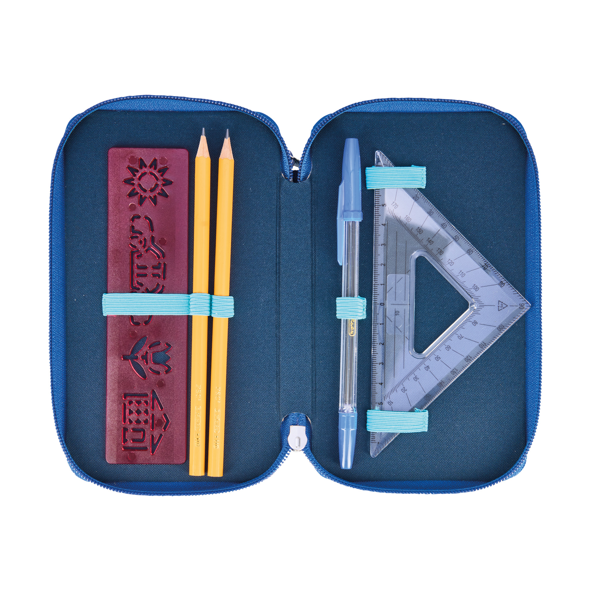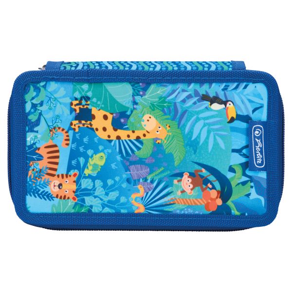 | Kernvorteile | für Schule; Uni oder Beruf; 3 Klappen mit farbigem Reißverschluss; Schlaufen in unterschiedlichen Größen; guter Überblick; leichter Transport; farbiges Innenmaterial aus PVC; Maße: 19 x 11;5 x 7 cm; Befüllung: Bunstifte, Fasermaler, Bleistifte, Lineal, Dreieck; Material: Polyester; Motiv: Jungle Safari |
