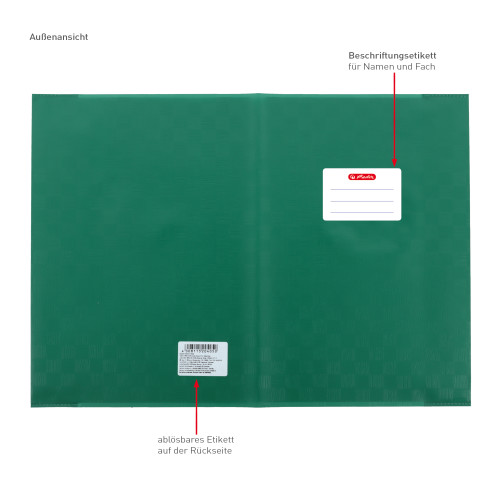 | Die Herlitz Hefthülle schützt Schulhefte im A4 Format. Der Heftumschlag aus Polypropylen ist abwischbar, schmutzabweisend, strapazierfähig, flexibel und 100 % pvc-frei. Auf der Vorderseite ist ein Etikett das mit Namen und Unterrichtsfach versehen werden kann. Die Einstecklaschen rechts und links auf der Innenseite geben dem Heft halt. Die optisch angenehme Baststuktur verleiht der Hefthülle das traditionelle Etwas. | |