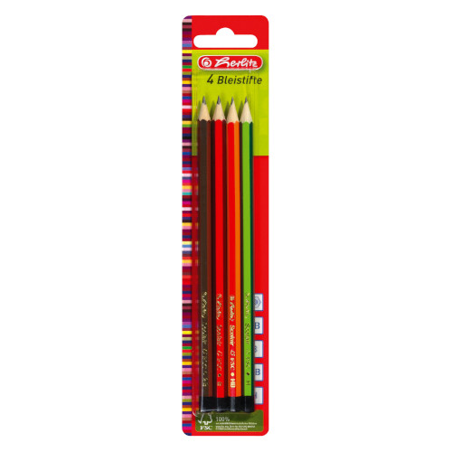 | Holz, lackiert bruchsichere Graphitmine Härtegrad H / HB / B / 2B Sechskantform FSC 100% 4 Stück auf Blisterkarte |