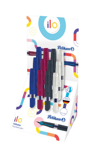 - 604628 - Pelikan Füller ilo, Feder M, 4 Farben sortiert im Display, Schwarz, Weiß, Blau, Rot (Einzelabbildung)