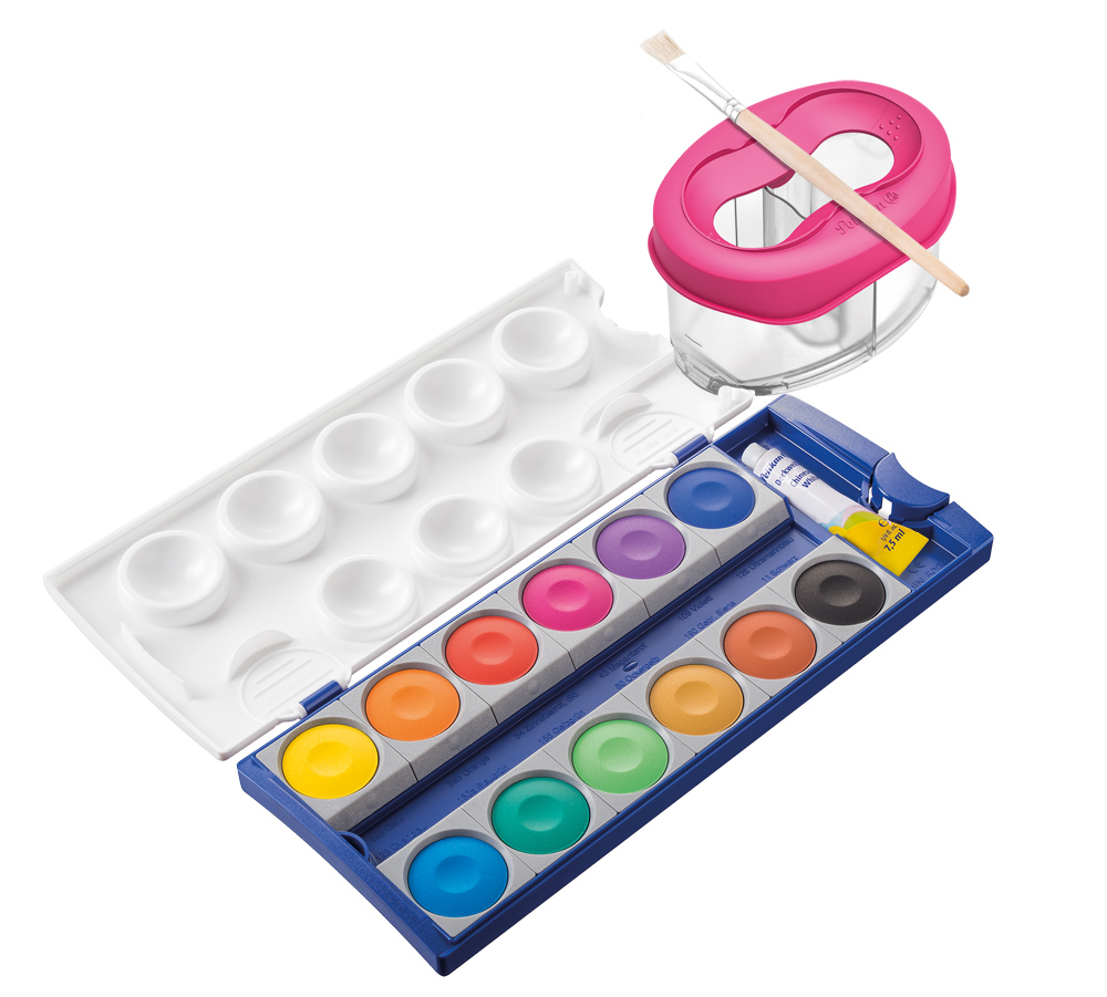 Deckfarbkasten 12 und 24 Farben und Wasserbox Space+ farbig sortiert, Schulmodul, dynamisch