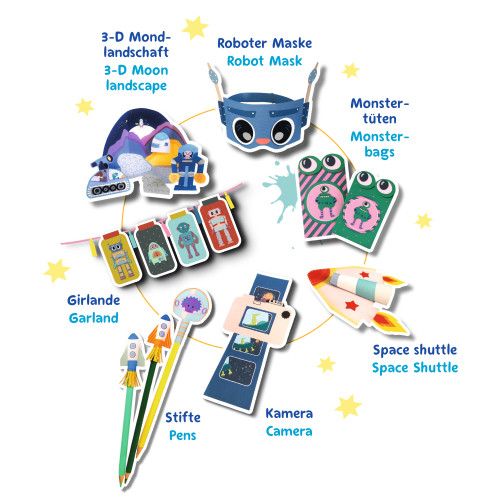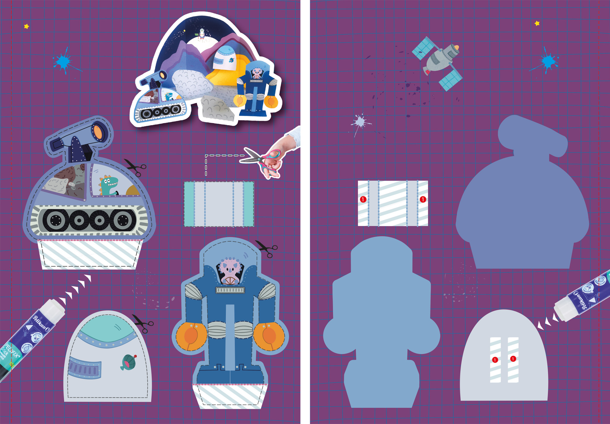 Bastel-Mal-Buch "Weltraum"; A4; Inhalt 32 Seiten; Grammatur Inhaltsseiten: 140g/m²; Grammatur Umschlag 300g/m²; Inhaltsseiten perforiert zum Abtrennen; Seiten beidseitig bedruckt; 2-Klammer Rückstichheftung; 7 Bastel- und Ausmalprojekte; Für 5-7 Jährige; FSC Mix; Fördert die Auge-Hand-Koordination