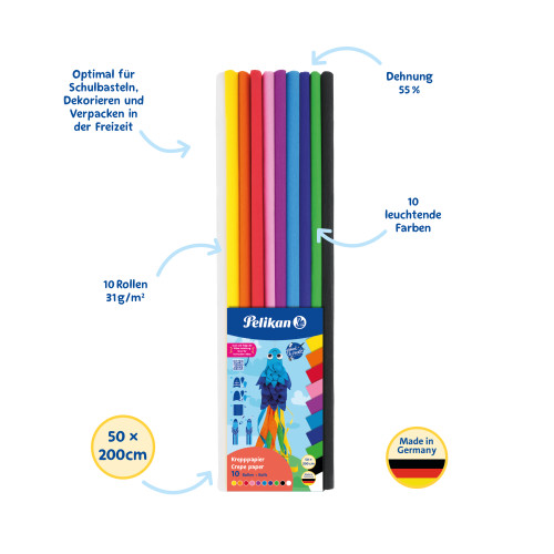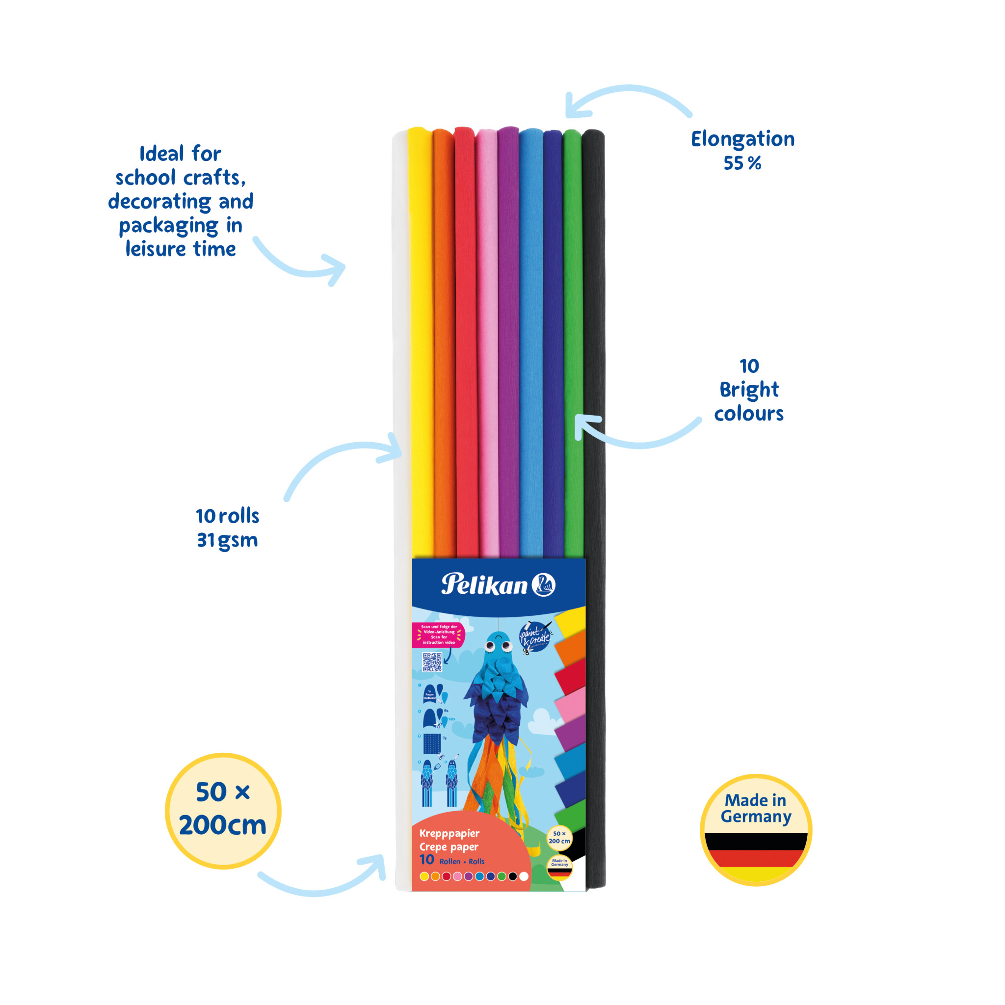 | Pelikan Krepppapier - Set Basic in 10 leuchtenden Farben. Die Rollen des hochwertigen Krepppapiers haben die Größe 50 x 200 cm. Optimal für Schulbasteln und Dekorieren und Verpacken in der Freizeit. 10 Rollen verpackt im Polybeutel mit Einleger. | |