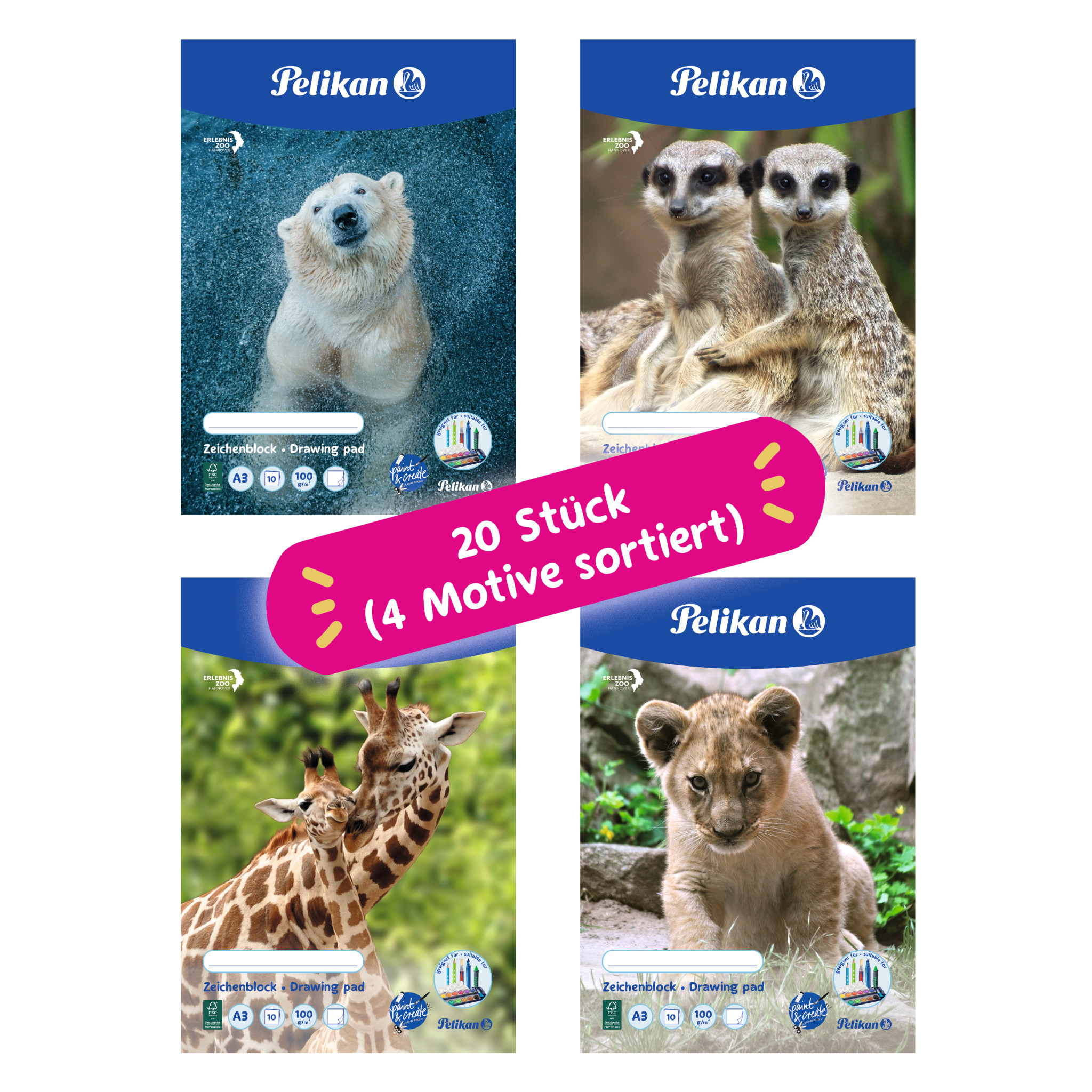 | Kernvorteile | Pelikan Zeichenblock A3; Perfekt für Schule und Freizeit; Für alle gängigen feuchten und trockenen Maltechniken hervorragend geeignet; Inhaltspapier aus FSC®-zertifiziertem Papier, 100g/m²; Inhaltspapier an zwei Seiten befestigt und exakt perforiert; Format der herausgetrennten Blätter vermindert sich durch Perforation um 2 cm in der Länge; Sehr stabile Rückenpappe: 800g/m²; 10 Blatt; Mit Namensfeld auf der Vorderseite; 4 schöne Tiermotive mit Original-Aufnahmen aus dem ZOO Hannover, keine Motivauswahl möglich |