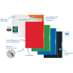Kernvorteile | Mit Gummiband zum sicheren Verschließen; Aus stabilem und hochwertigem Karton; Mit Namensfeld zur individuellen Beschriftung; Format: A4; Farbig sortiert; FSC.Mix Material; Made in Germany |