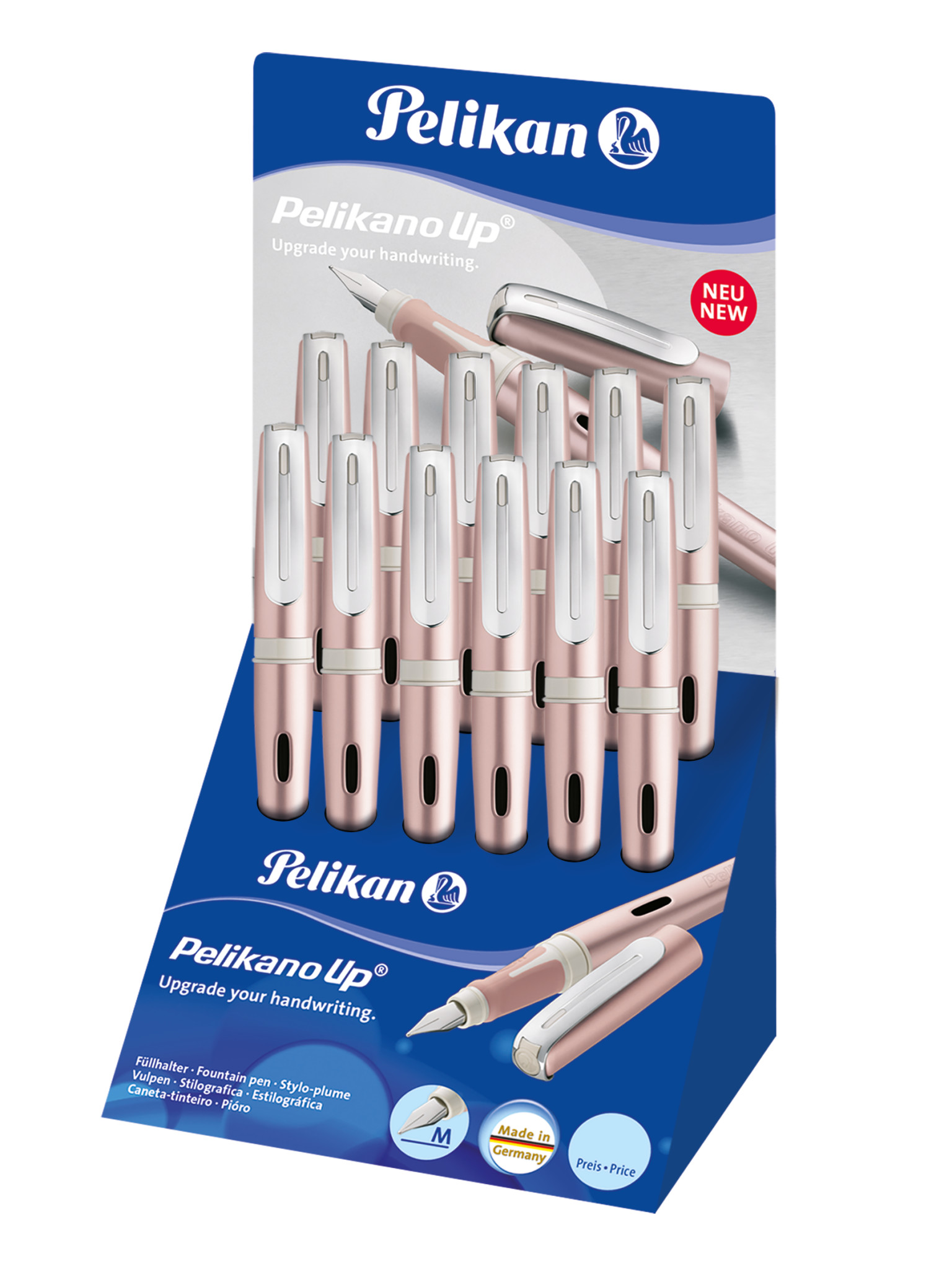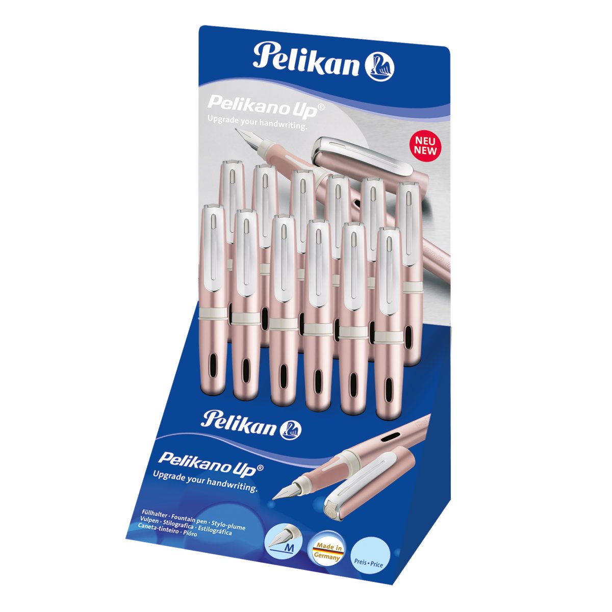 Pelikano® Up - upgrade your handwriting! Neuer, hochwertiger Metallfüllhalter aus Aluminium mit attraktivem Clip-Design in der Trendfarbe Golden Glam. Mit neuer Soft-Griffzone für ermüdungsfreies Schreiben. Modelle für Links- und Rechtshänder erhältlich. Made in Germany. |