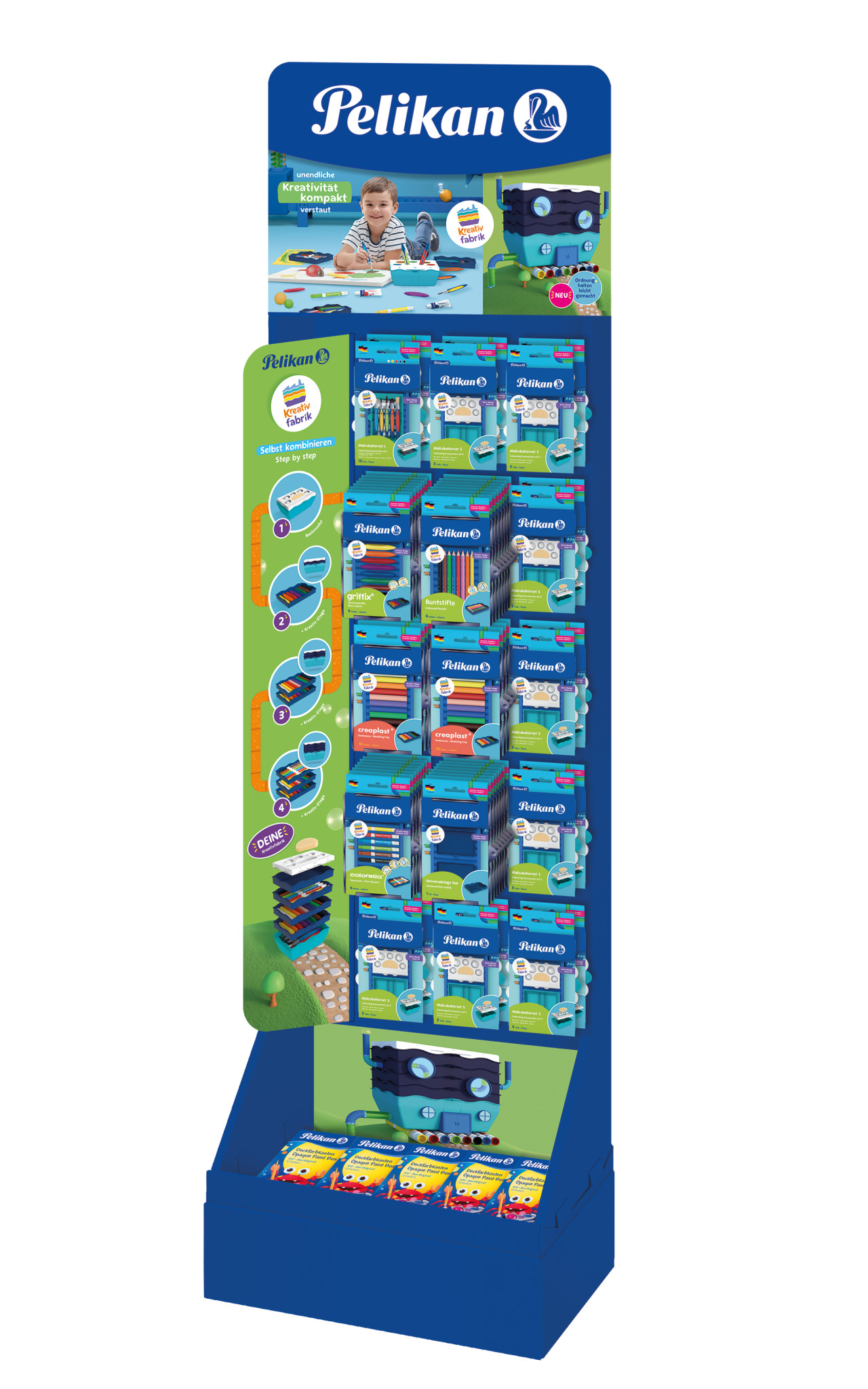 | POS-Display, befüllt aus Pappe, Farbe Blau Größe (B x H x T): 40 x 193 x 60 cm Inhalt: 73 Stück Schulbedarfsartikel 16 Stück Kreativfabrik Malzubehörset klein MZSK 2 Stück Kreativfabrik Malzubehörset groß MZSG, 5x Pinsel griffix, 5x Tempera Tuben 12ml. 8 Stück Kreativfabrik Wachsmaler griffix 8 leuchtende Farben in Universaletage 8 Stück Kreativfabrik Buntstifte 8 Farben in Universaletage FSC 8 Stück Kreativfabrik Knete Creaplast 10 Farben in Universaletage 8 Stück Kreativfabrik Colorella FM wasservermalbar 6 Farben in Universaletage 8 Stück Kreativfabrik Universaletage leer 15 Stück Deckfarbkasten 735K/12 Sortiment Malen  |