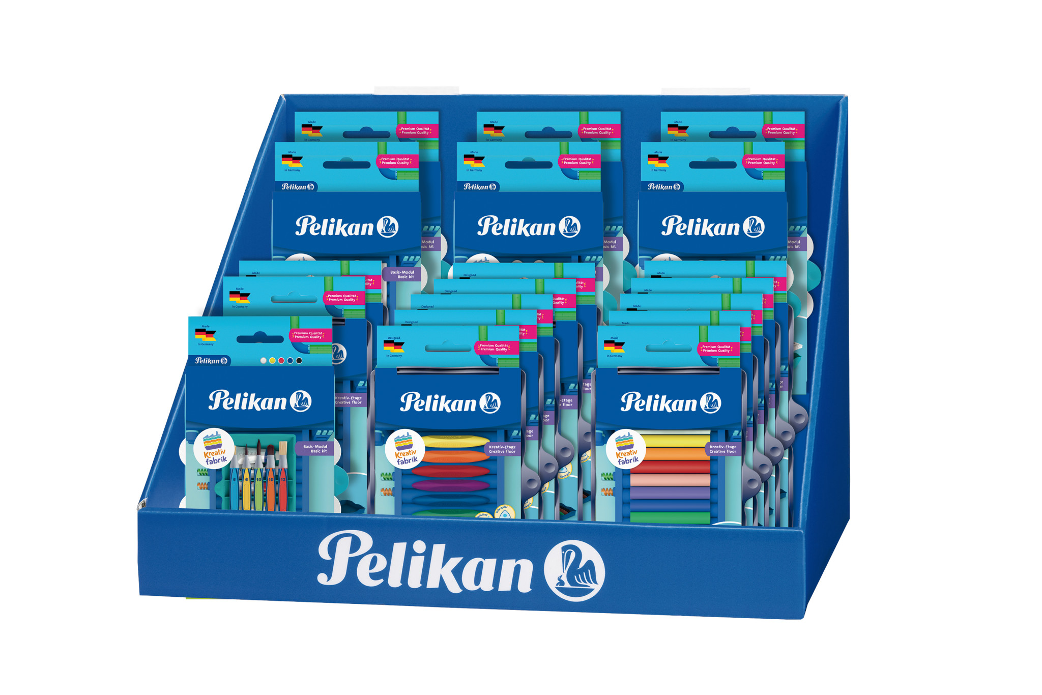 | POS-Display, befüllt aus Pappe, Farbe Blau Größe (B x H x T): 39 x 28,5 x 28,5 cm Inhalt: 19 Stück Schulbedarfsartikel 6 Stück Malzubehörset klein 1 Stück Malzubehörset groß 2 Stück Universaletage leer 5 Stück Universaletage griffix Wachsmaler 5 Stück Universaletage Creaplast Knete Sortiment Malen und Basteln  |