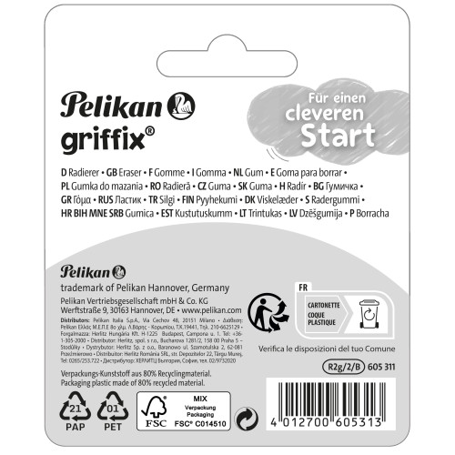 | Kernvorteile | Pelikan griffix Radierer in Stiftform mit großer Dreikantgriffzone; Mit Spitze auf der einen Seite für präzises Radieren und abgerundeter Spitze auf der anderen für größere Bereiche; Hochwertiges TPE-Radiermaterial; 2 Stück farbig sortiert auf Blisterkarte; Farben: Weiß und blau auf Blisterkarte aus FSC Material; Blisterhaube aus Recyclingfolie. |