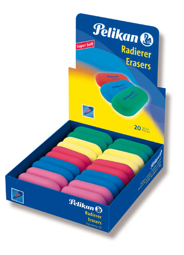 20 Kunststoff-Radierer in Schachtel. Für Bleisift. Abgerundete Kieselform. Liegt angenehm in der Hand. Erhältlich in 4 Farben: Rot, Blau, Grün, Gelb, Pink. | |