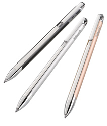 Schlanker Kugelschreiber aus Aluminium in den Trendfarben Champagner, Silber und Schwarz, inkl. einer Klarsicht-Geschenkbox. Elegante Anmutung durch die Linienführung des Clips mit gleichzeitiger Minenschaltung. Druckmechanik mit internationaler, dokumentenechter Großraummine mit schwarzer Schreibfarbe. Außergewöhnliches Design in einem harmonischen Mix aus glänzend- und matt-veredelter Oberfläche. | |