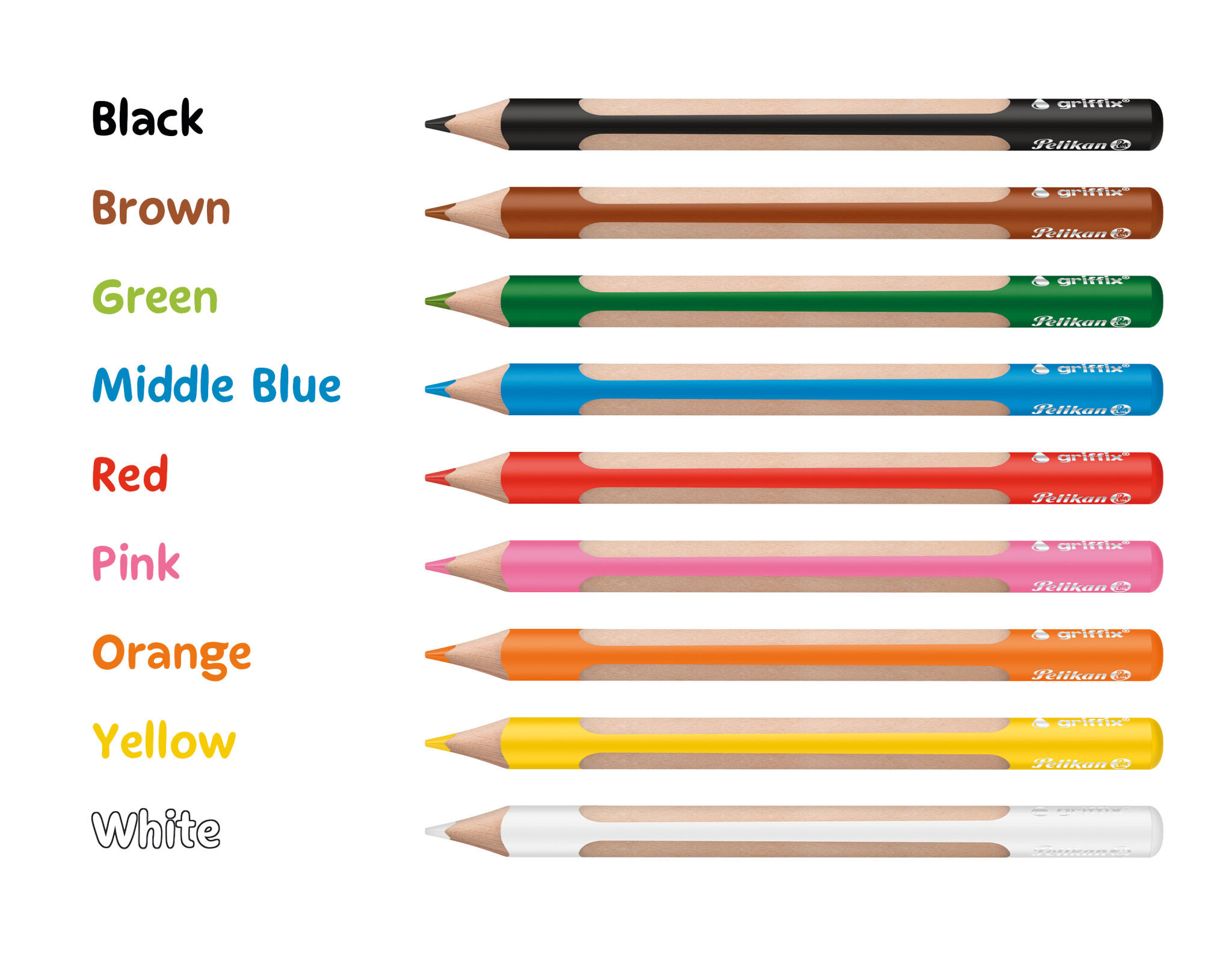 Kernvorteile | 9 griffix Holz-Buntstifte mit langer ergonomischer Dreikant-Griffzone; 9 kräftige Farben: gelb, orange, pink, rot, blau, grün, braun, schwarz + weiß; Ideal auch zum Malen auf buntem oder schwarzen Papier; Qualitätsmine 4 mm; Wasservermalbare Mine für Aquarelleffekte; Kinderlänge 140 mm; Aus 100% FSC Holz; In stabiler Aufbewahrungs-Faltschachtel |