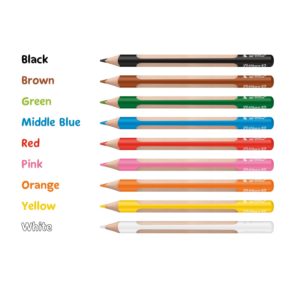 | Kernvorteile | 9 griffix Holz-Buntstifte mit langer ergonomischer Dreikant-Griffzone; 9 kräftige Farben: gelb, orange, pink, rot, blau, grün, braun, schwarz + weiß; Ideal auch zum Malen auf buntem oder schwarzen Papier; Qualitätsmine 4 mm; Wasservermalbare Mine für Aquarelleffekte; Kinderlänge 140 mm; Aus 100% FSC Holz; In stabiler Aufbewahrungs-Faltschachtel |