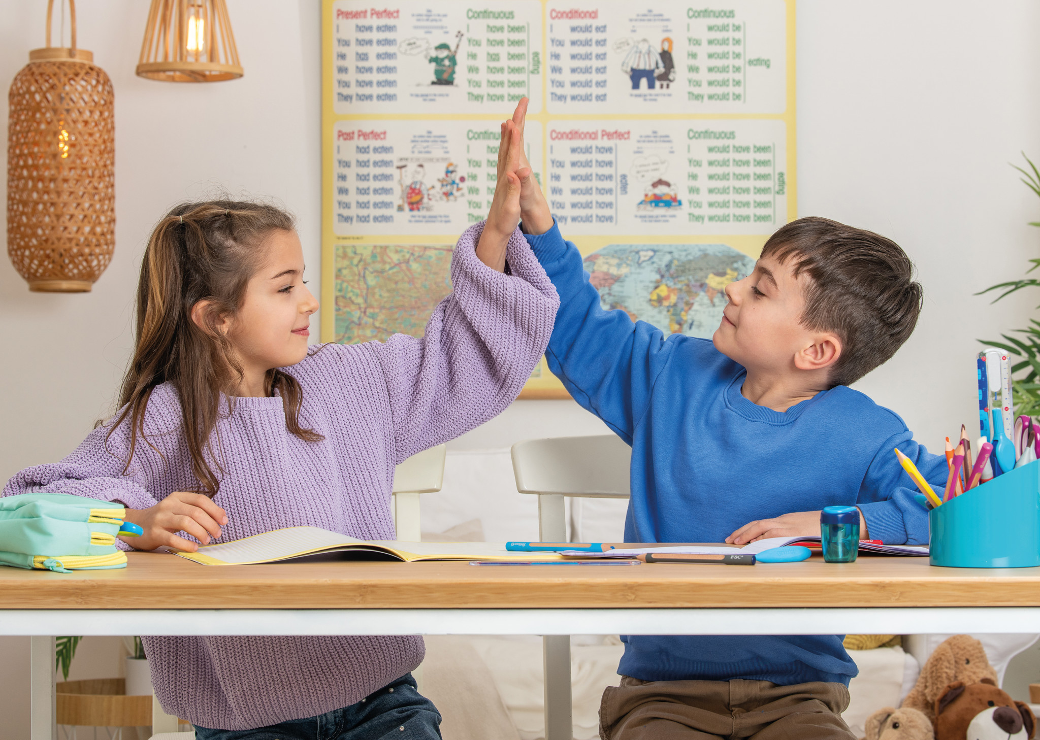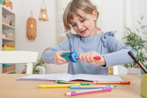 griffix Lineal, Radierer, Anspitzer im Focus, Buntstifte, Bleistifte, Schere spitz, Hände rechteckig