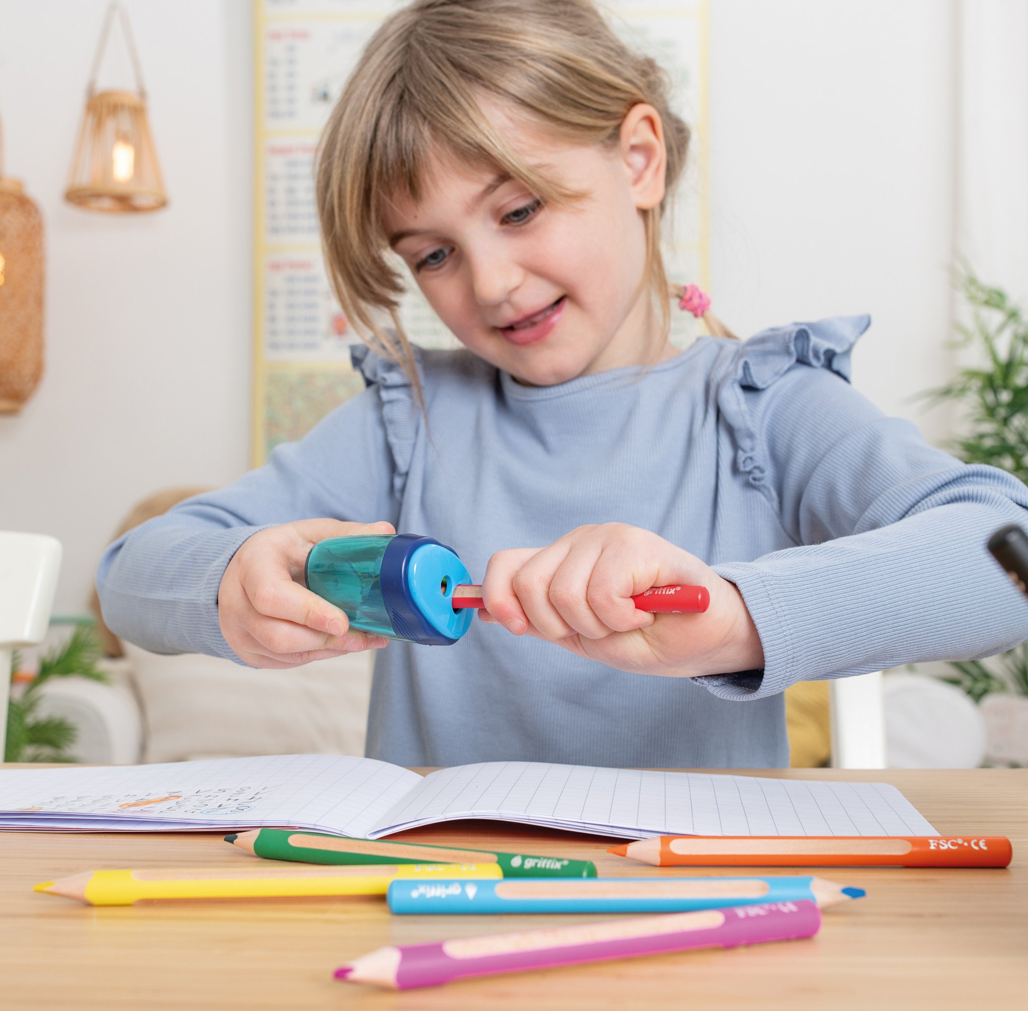 griffix, Buntstifte, Bleistifte, Radierer, Anspitzer Druckbleistift, Schere spitz, Hände, rechteckig