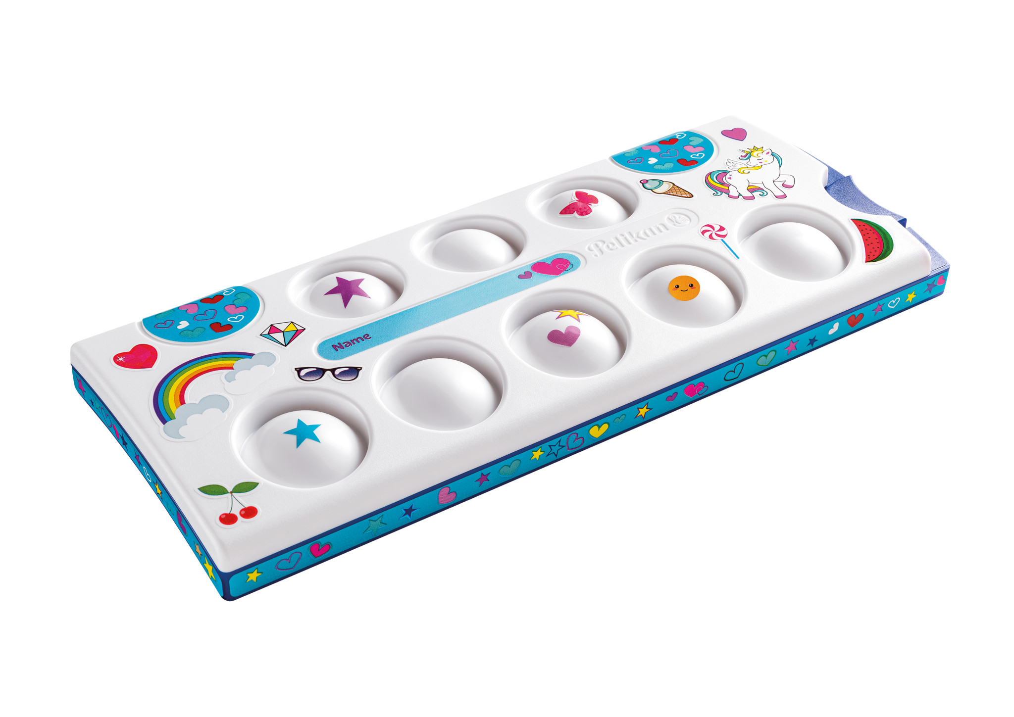 Stickerbogen Türkis/Herzen für Deckfarbkasten K12/K24, wasserfest zur Individualiserung des K12 oder K24 Deckfarbkastens. Die Seitenflächen, das Namensfeld sowie sämtliche Flächen des Malkastens können damit verziert werden und machen den Tuschkasten zum Hingucker und Unikat. Die Motive Herzen, Regenbogen, Einhorn, Sterne usw. lassen Kinderherzen höher schlagen. 1 Stickerbogen im Polybeutel mit Euroloch. | |