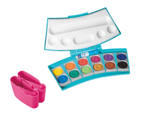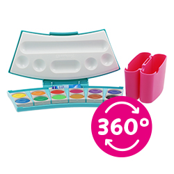 | Kernvorteile | Farbkasten mit auswechselbaren Farbschälchen; Farbschälchen aus 95% recyceltem Kunststoff; Mit 12 Qualitätsfarben; Hohe Deckkraft; Lichtechte Pigmente; Herausnehmbare Mischpalette; Mit 2 abnehmbaren Wasserboxen; Inklusive Deckweiß; Farbe: Türkis/Pink; Made in Germany |