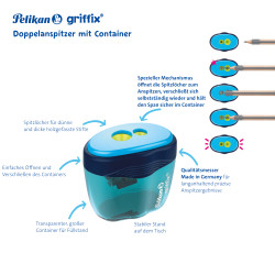 Kernvorteile | Pelikan griffix Doppeldosenanspitzer mit speziellem Lochverschluss, der den Span sicher im Container hält; Für holzgefasste Stifte Standard und dick; Qualitätsmesser "Made in Germany" für langanhaltend präzise Anspitzergebnisse; Stabil stehender, transparenter Container mit einfachem Clickverschluss zum Entleeren; Maße: 56 x 6 x 39mm; 1 Stück in blau auf Blisterkarte; Blisterkarte aus FSC Material, Blisterhaube aus Recyclingfolie |