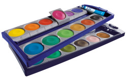 | Kernvorteile | Farbkasten mit auswechselbaren Farbschälchen; Farbschälchen aus 95% recyceltem Kunststoff; Mit 24 Qualitätsfarben; Starke Deckkraft dank hoher Pigmentdichte; Abnehmbarer Deckel mit Mischtöpfchen; Leicht zu reinigen; Platz für Pinsel im Deckel; Einfacher Klickverschluss; Platzsparend; Anschauliche Darstellung des Farbkreises; Stabiles Material; Mit Namensfeld für individuelle Beschriftung; Inklusive Deckweiß; Farbe: Blau-Weiß; Made in Germany |
