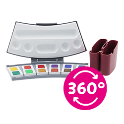 Kernvorteile | Aquarell Malkasten mit auswechselbaren Farbschälchen; Mit 12 Farben in Künstlerqualität; Hochwertige Pigmente in feinster Korngröße; Satte Farbtöne mit hoher Farbdichte; Sehr gute Lichtbeständigkeit; Abnehmbarer Deckel mit Mischtöpfen; Deckel leicht zu reinigen; Mit 2 abnehmbaren Wasserboxen |