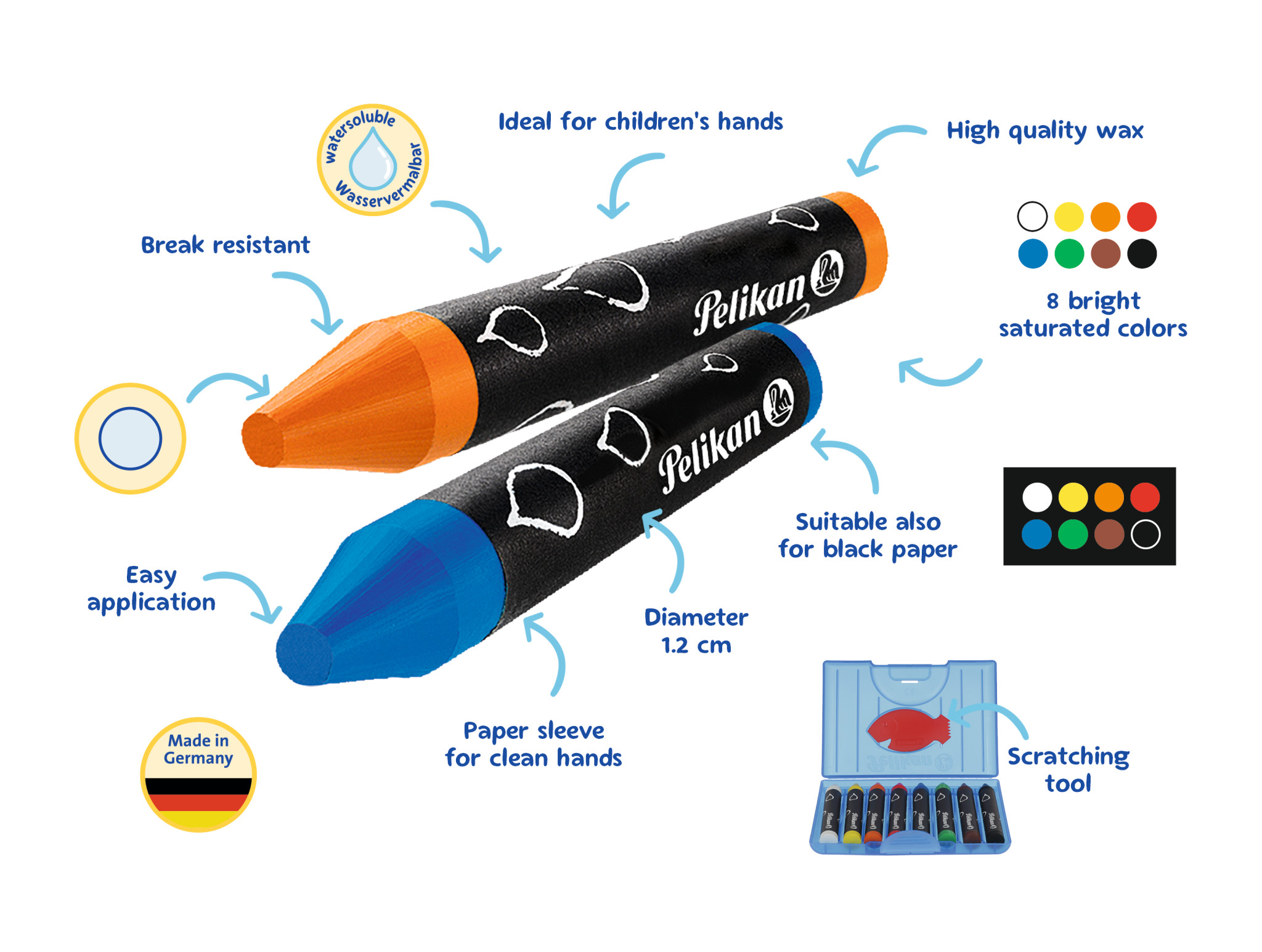 | Kernvorteile | 8 Wachsmalstifte in bunten Farben; Runde Wachsmaler; Wasservermalbar; Bruchstabil; Leichter Farbauftrag; Ideal zum Malen und Schreiben lernen; Im stabilen Kunststoff-Etui; Inklusive Schaber; Farben: Weiß, Gelb, Orange, Rot, Blau, Grün, Braun, Schwarz, Made in Germany |