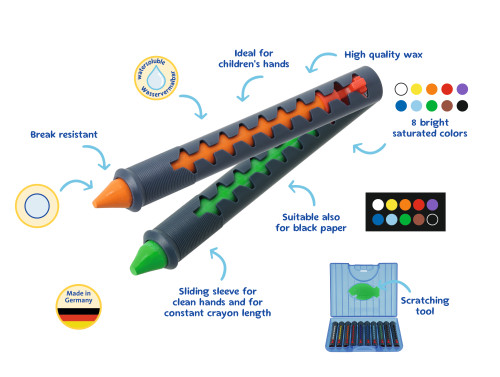 Kernvorteile | 10 Wachsmalstifte in bunten Farben; Runde Form; Wasservermalbar; Bruchstabil; Leichter Farbauftrag; Ideal zum Malen und Schreiben lernen; Im stabilen Kunststoff-Etui; Inklusive Schaber; Farben: Weiß, Gelb, Orange, Rot, D-Blau, H-Blau, Lila, Grün, Braun, Schwarz; Made in Germany |