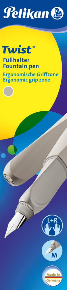 Schachtel mit 1 Füller inkl. Tintenpatrone. Twist - das neue Trend- Schreibgerät. Echte Hingucker mit trendigen Farbkombinationen und in gedrehtem Look. Liegt durch die ergonomische Form perfekt in der Hand. Universell für Rechts- und Linkshänder. Füller mit sanft gleitender Edelstahlfeder.